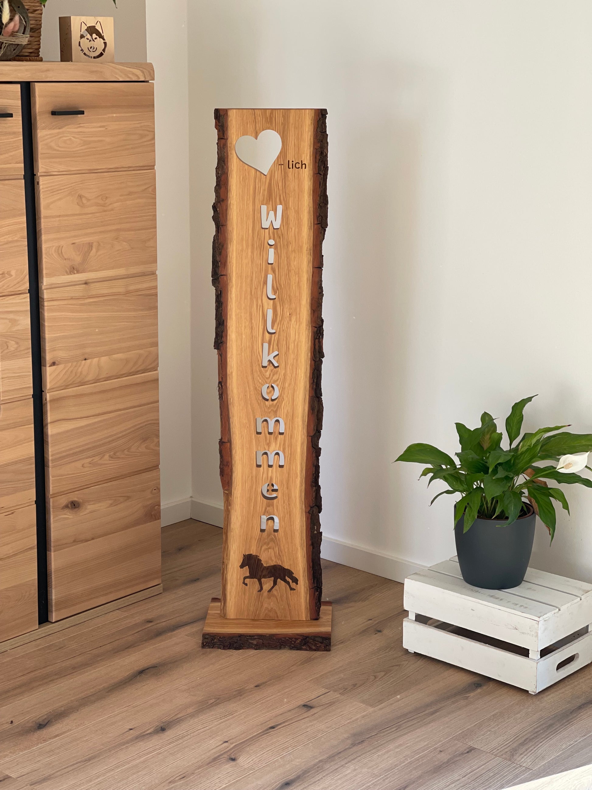 Diese große Stele aus massiver Eiche mit Baumkante ist ein echter Blickfang für Eingangsbereiche, Hof oder Stall. Der ausgefräste Schriftzug „♡-lich Willkommen“ und das fein eingelasertes Töltermotiv verleihen ihr eine besondere, handwerkliche Note. Durch die geölte Oberfläche ist die Stele optimal für den Einsatz im Innen- und Außenbereich geeignet.