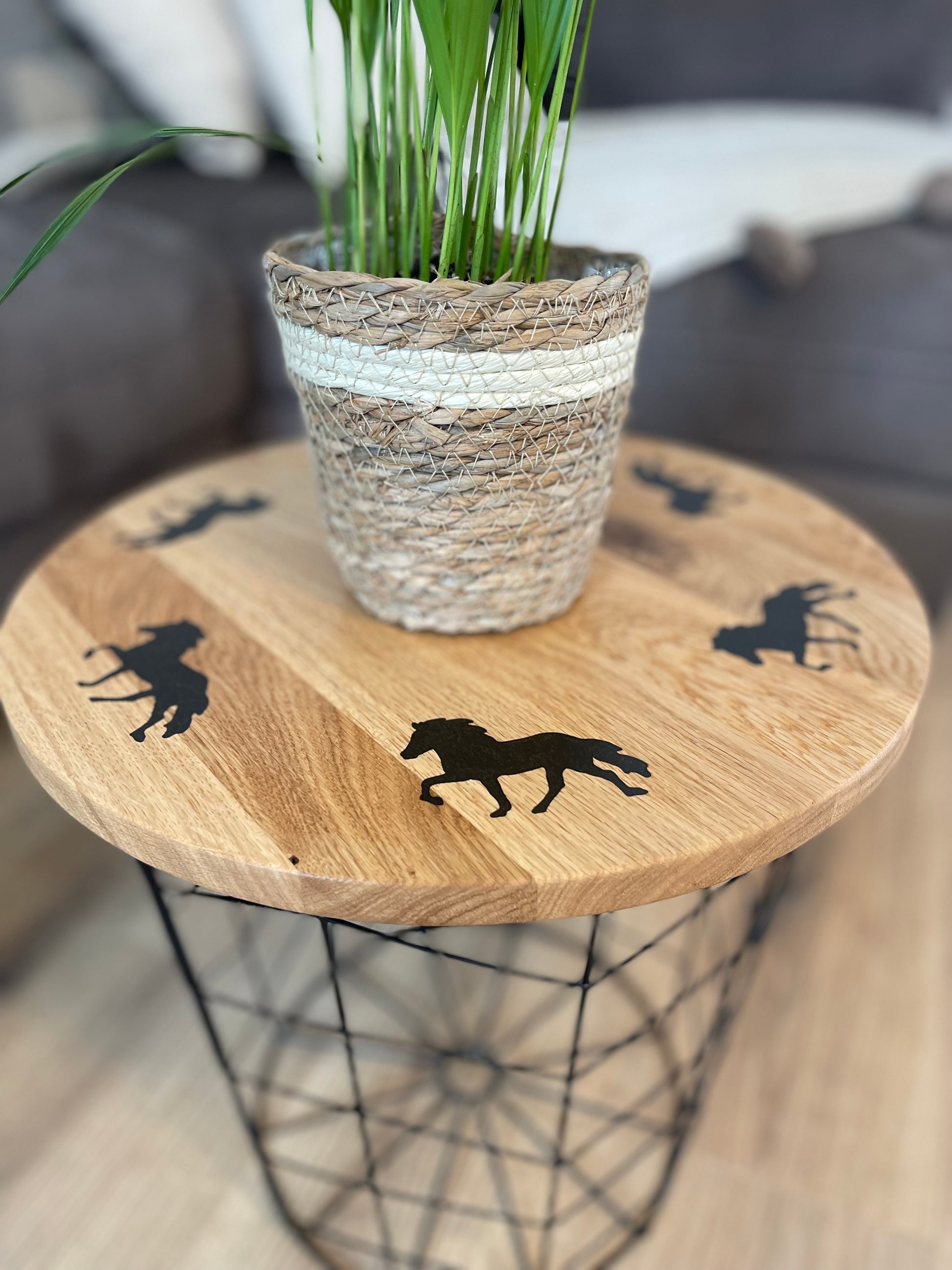 Dieser elegante Beistelltisch vereint natürliches Design mit Liebe zum Detail. Die Tischplatte aus hochwertigem Eiche-Leimholz (Ø 40 cm) wurde mit eingefrästen Tölter-Motiven, die mit Epoxidharz ausgegossen sind, veredelt. Dadurch entsteht ein stilvoller Kontrast zwischen warmem Holz und moderner Harzoptik.