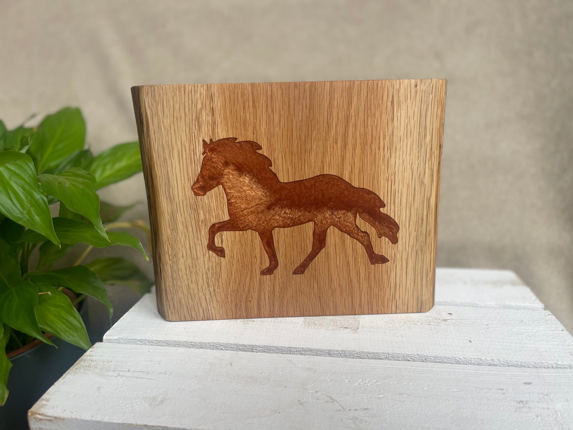 Diese handgefertigten Kunststücke aus massivem Eichenholz vereinen rustikale Natürlichkeit mit moderner Epoxidharzkunst. Das Motiv wird eingefärbt und anschließend mit farbigem Harz ausgegossen – jedes Stück ein echtes Unikat.