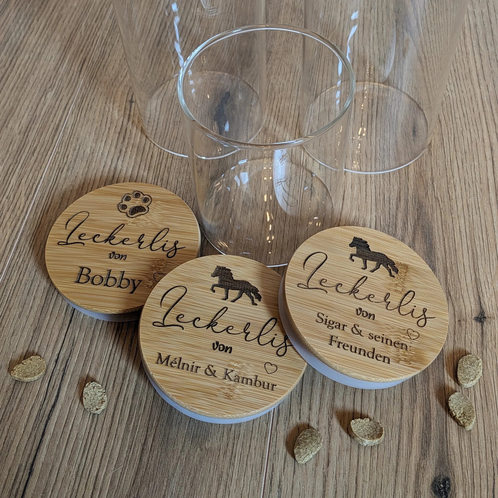Mach dein Leckerliglas einzigartig! Gestalte dein Glas ganz nach deinen Wünschen – mit eigenem Motiv, Namen oder Schriftzug. So wird die Snackzeit für dein Pferd oder deinen Vierbeiner besonders persönlich und stilvoll.