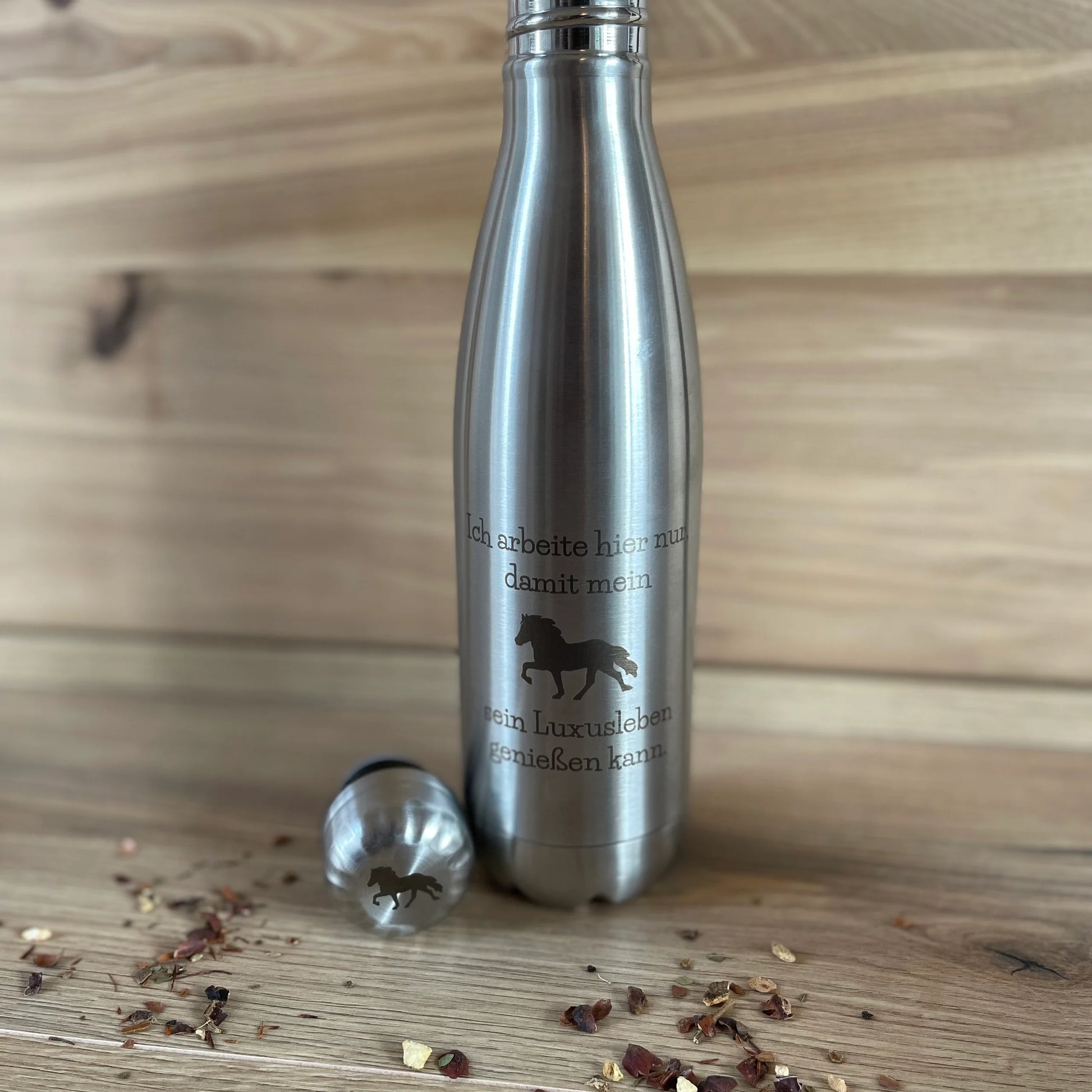 Unsere Isolierflasche aus Edelstahl mit humorvollen Auftrag "Ich arbeite hier nur, damit mein Pferd sein Luxusleben genießen kann." sorgt auch an stressigen Tagen für gute Laune. Mit ihrem schlichten, modernen Design und einem Tölter auf dem Deckel ist sie der ideale Begleiter für Schule, Alltag oder unterwegs.