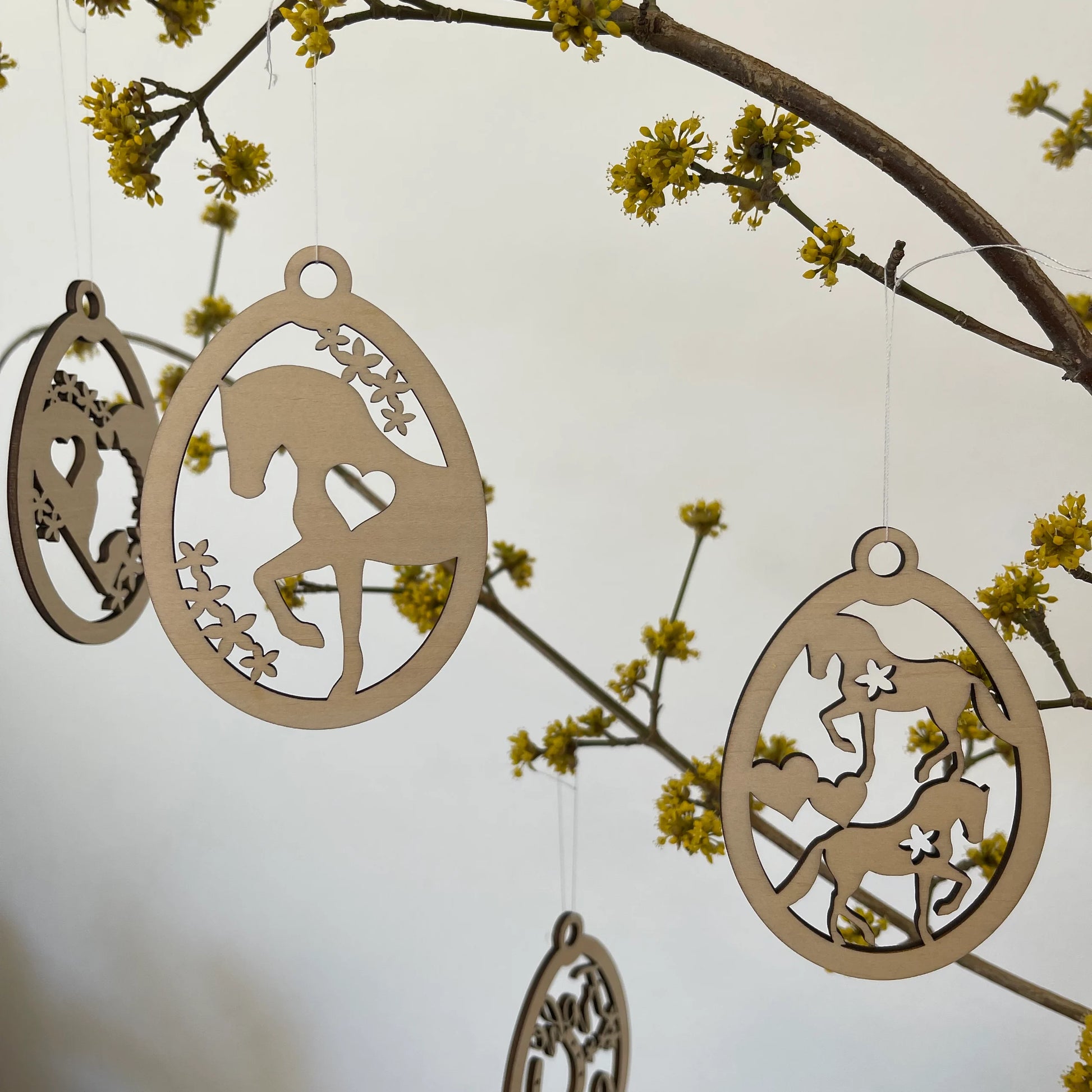 Die sechs unterschiedlichen Pferdemotive sorgen für Abwechslung und machen den Schmuck zu einem echten Hingucker – ob am Osterstrauch, am Fenster oder als kleine Geschenkidee.
