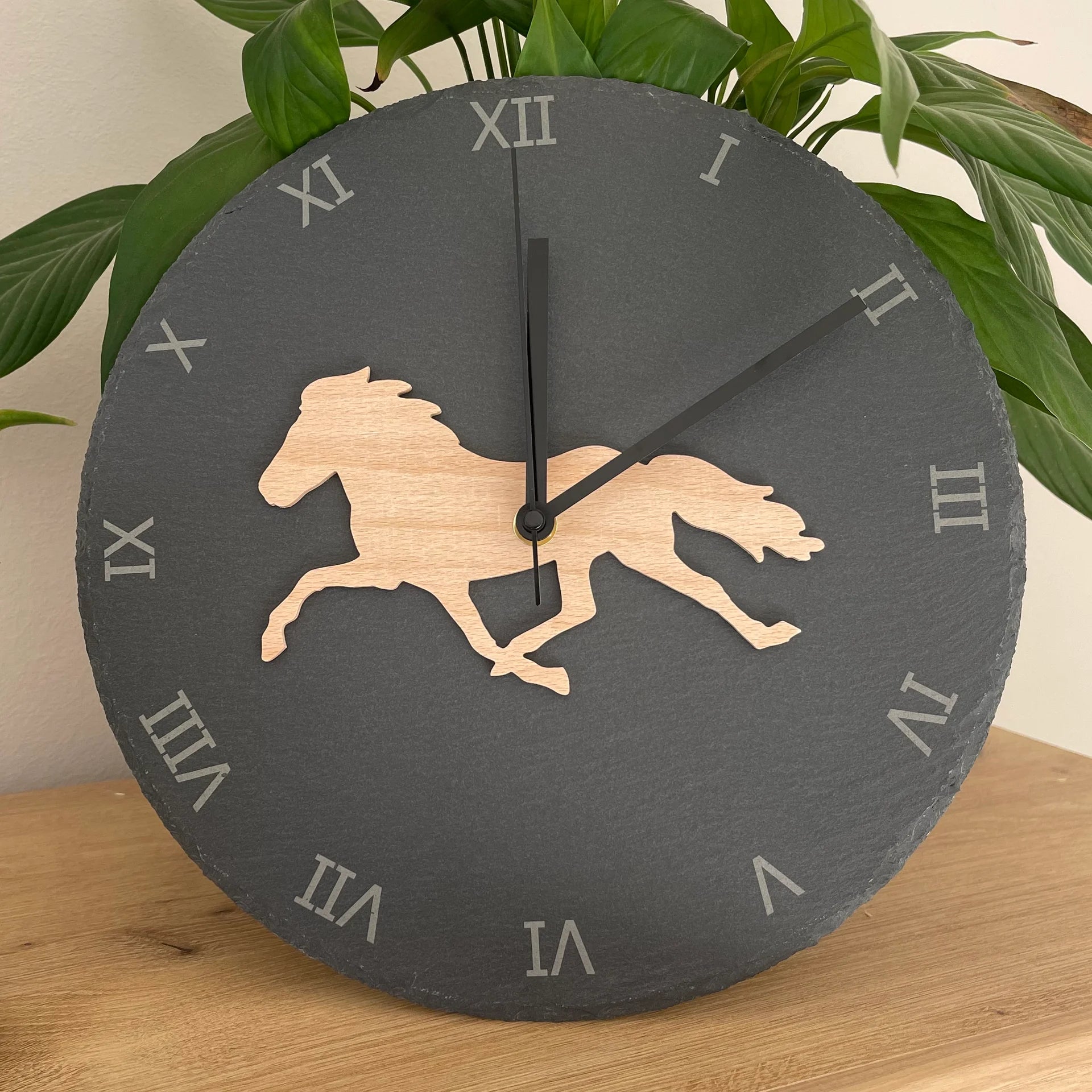 Die Schieferuhr vereint natürliche Materialien mit stilvollem Design – ein ideales Geschenk oder dekoratives Element für Zuhause, Büro oder Reitstall.