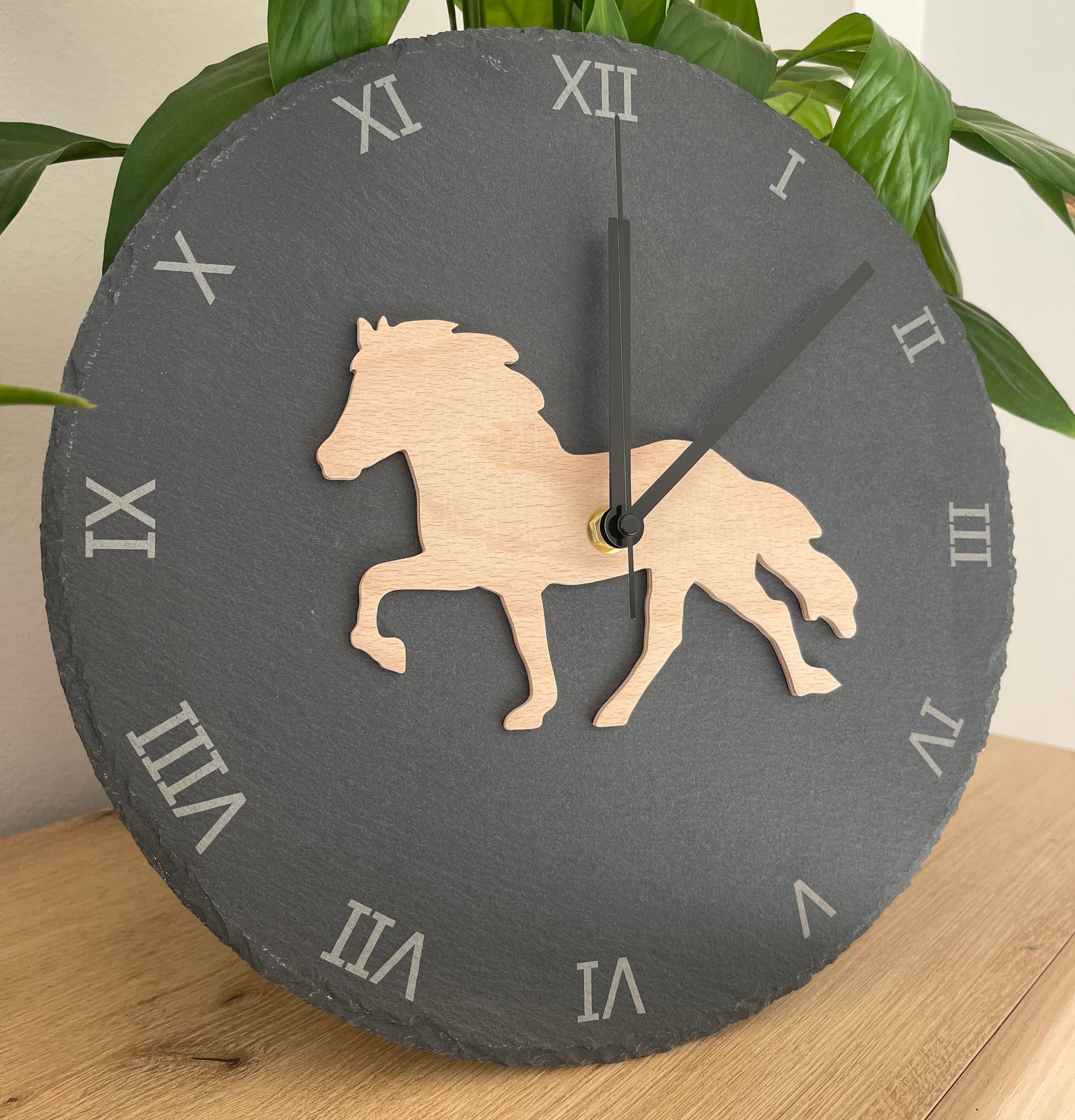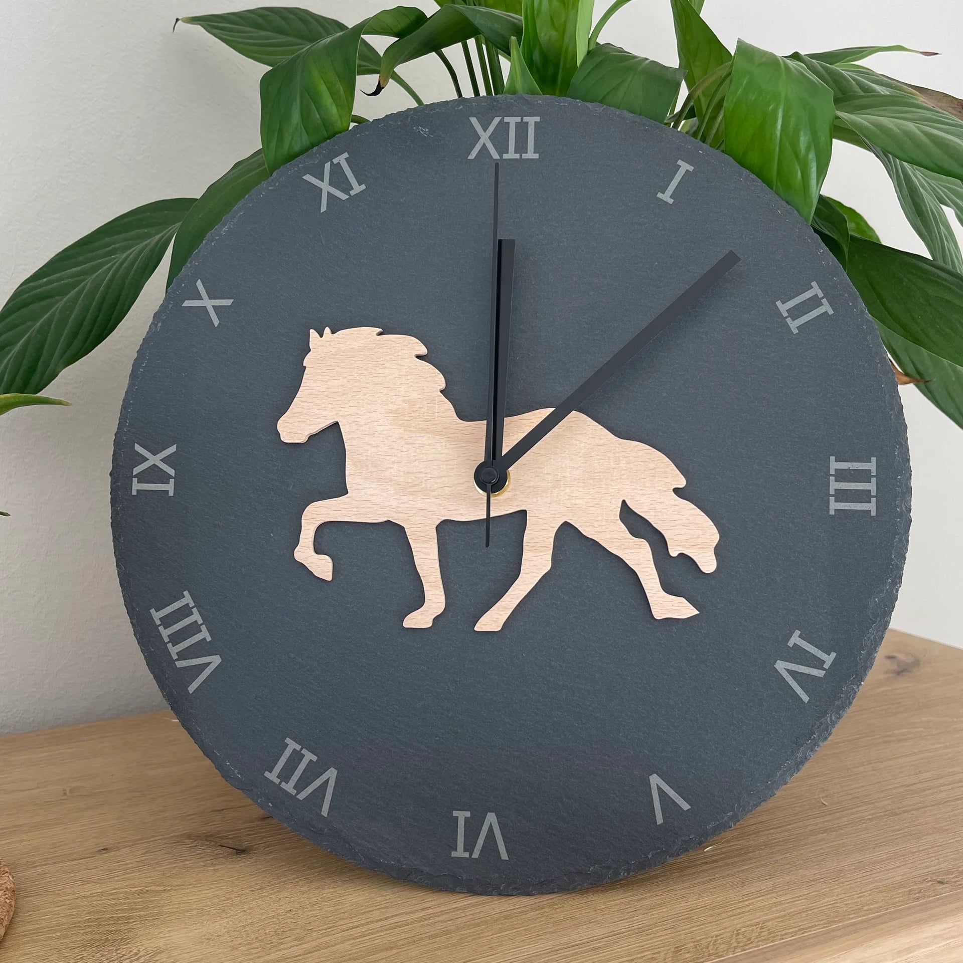 Die Schieferuhr vereint natürliche Materialien mit stilvollem Design – ein ideales Geschenk oder dekoratives Element für Zuhause, Büro oder Reitstall.