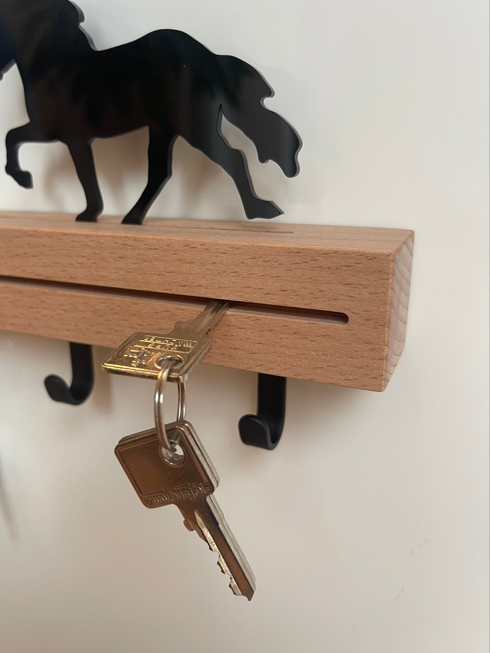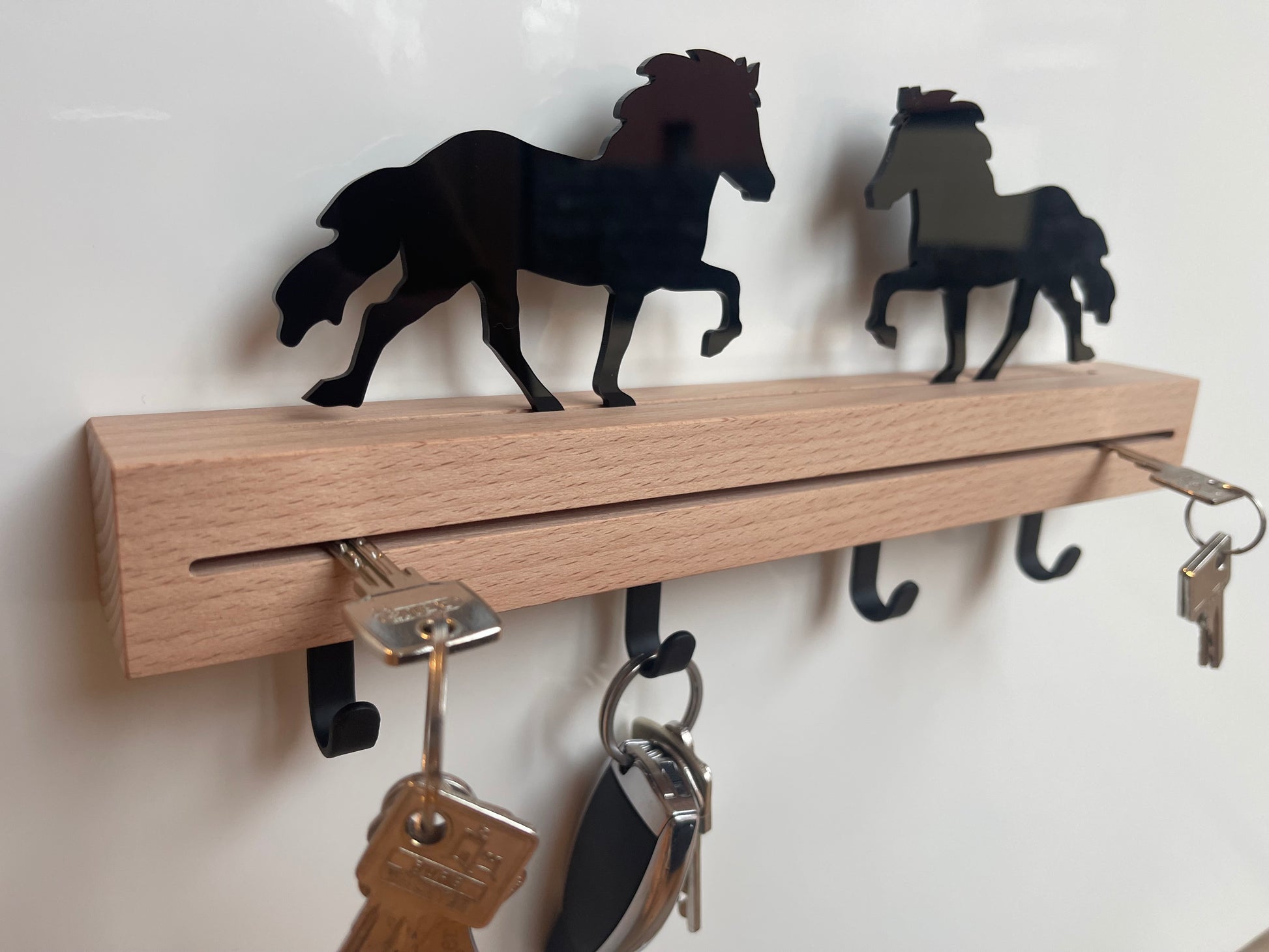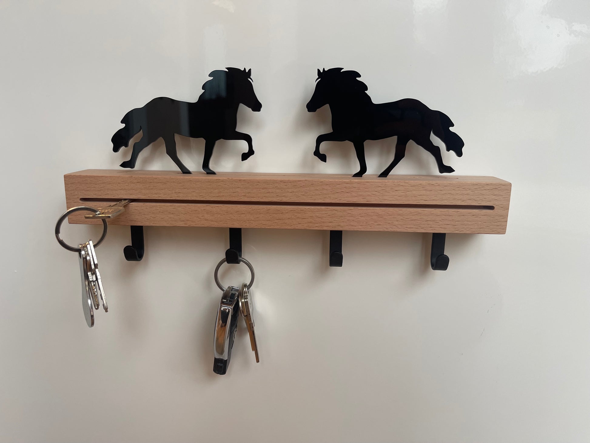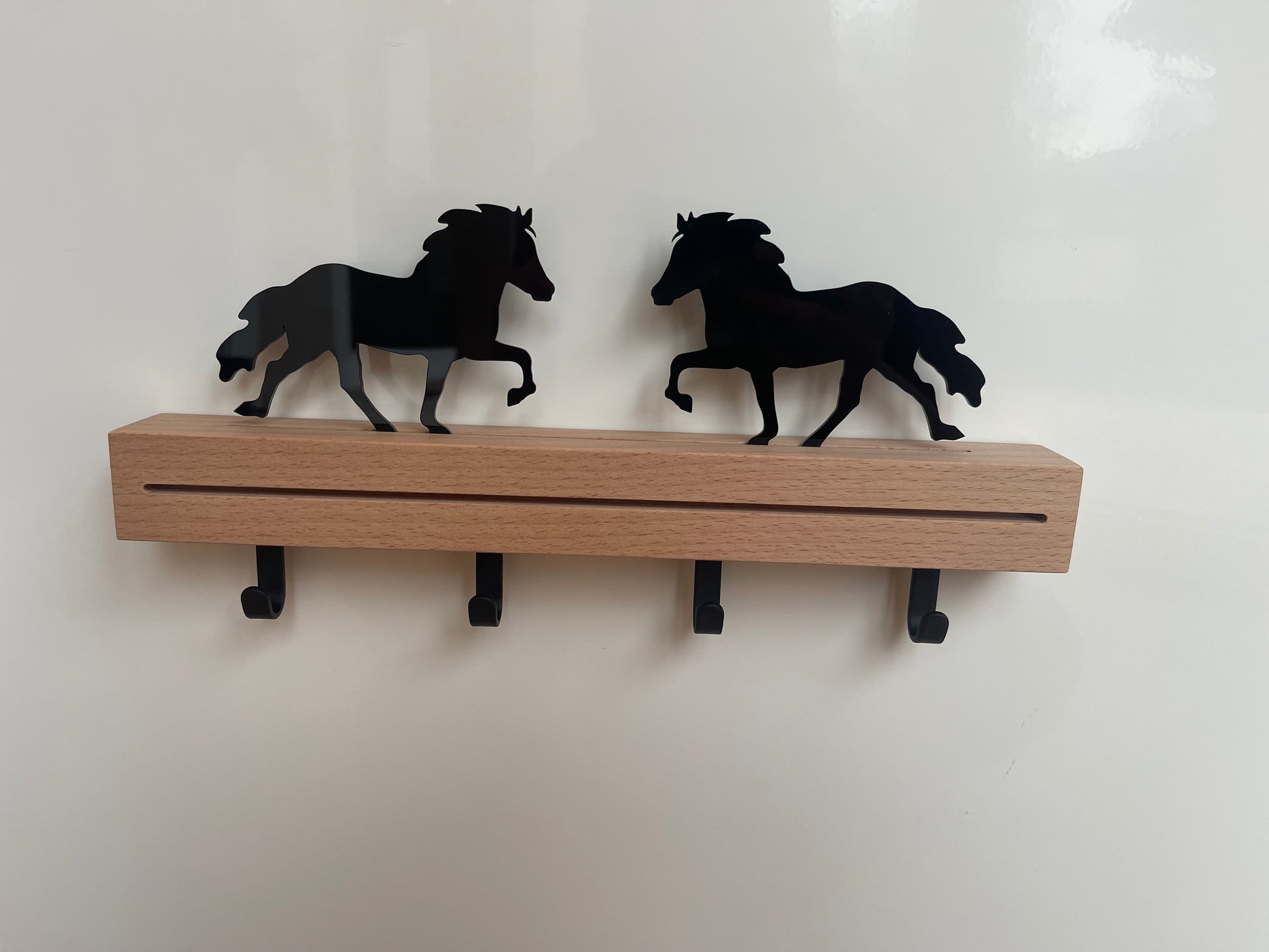 Ein besonderes Highlight sind die edlen Tölter aus schwarzem Acryl, die dem Schlüsselbrett eine moderne und zugleich charakterstarke Note verleihen – ideal für Pferdeliebhaber und Designfreunde.