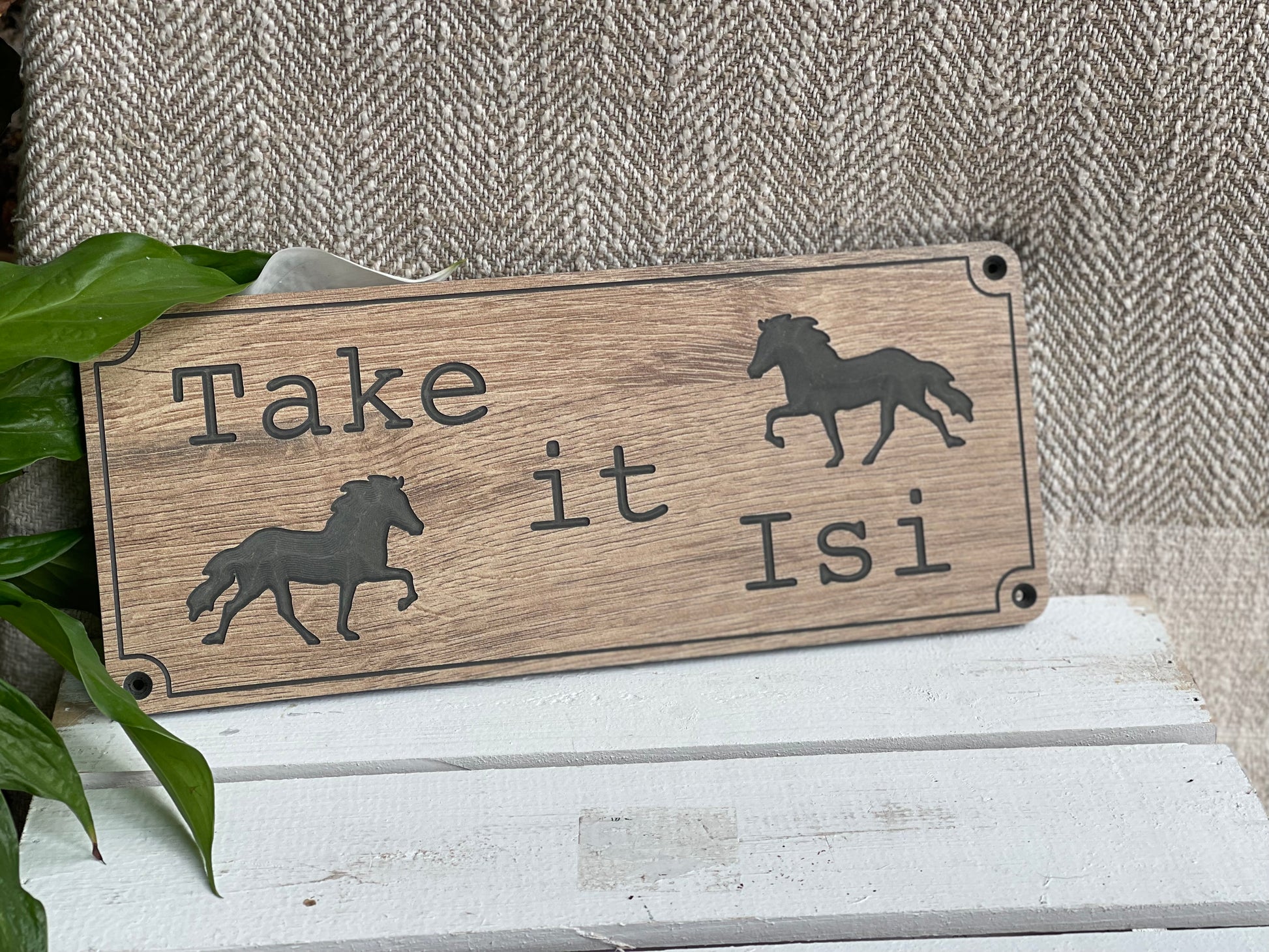 Bringe deinen Lieblingsplatz zum Strahlen! Unser dekoratives Schild zeigt die Aufschrift „Take it Isi“ und ein liebevolles Tölter-Motiv – perfekt für deinen Stall!