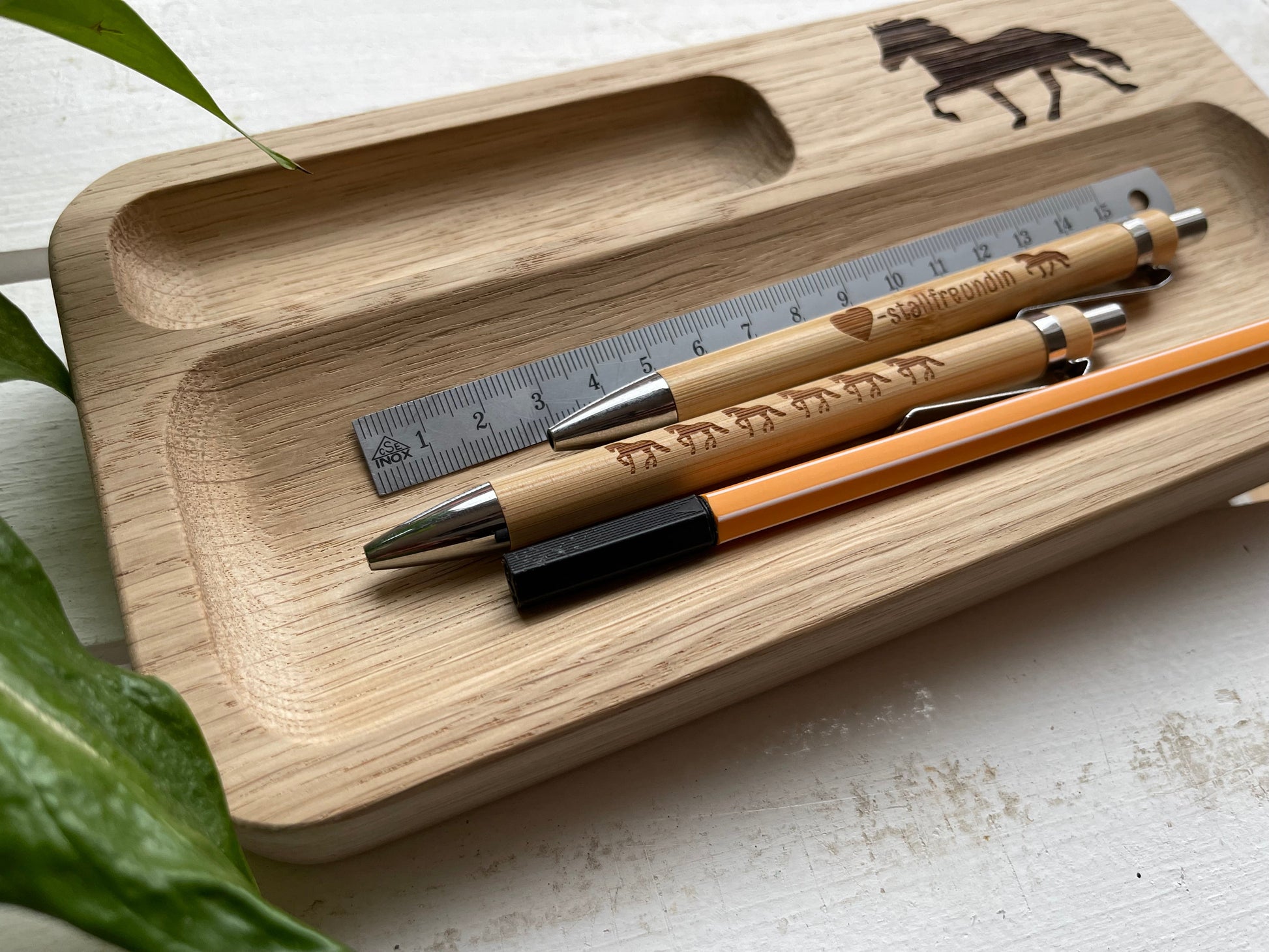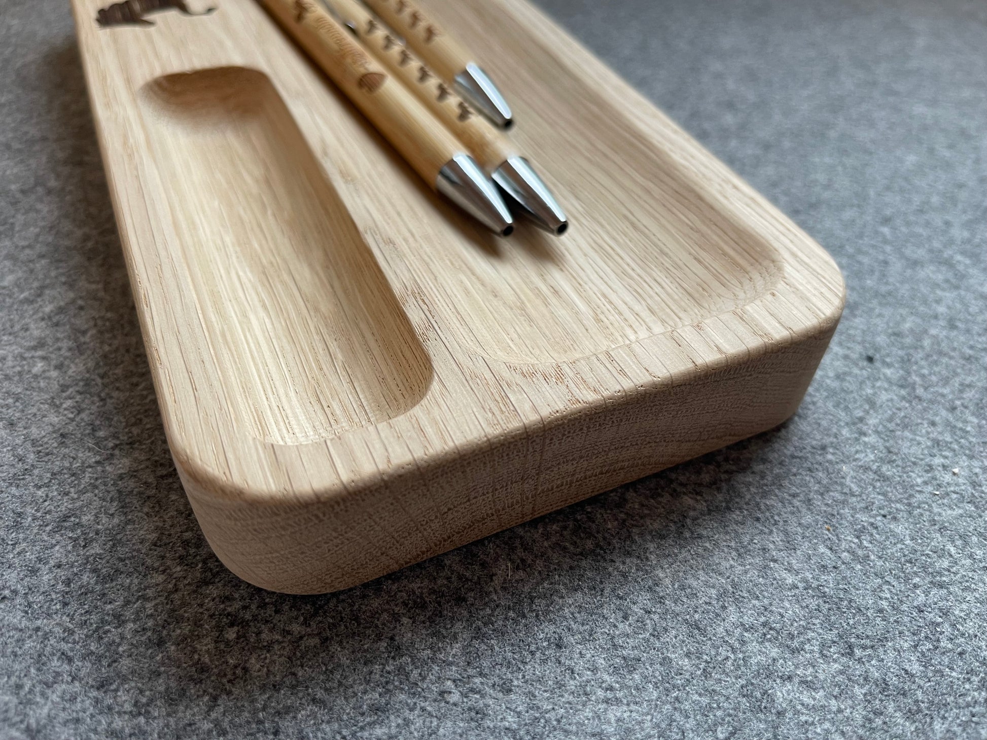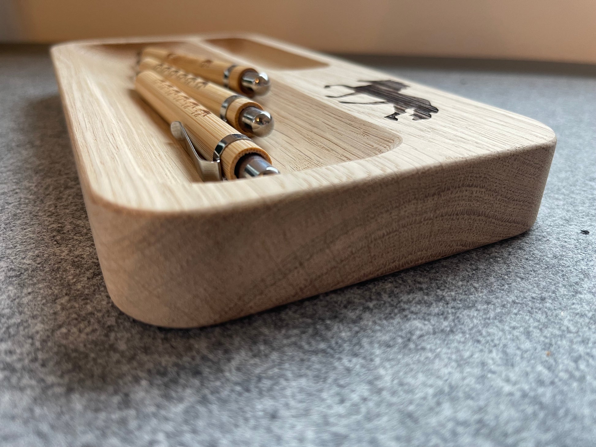Diese edle Stifteschale vereint funktionales Design mit handwerklicher Präzision. Gefertigt aus einem Stück massiven Eiche, überzeugt sie durch ihre natürliche Maserung, hohe Stabilität und eine besonders wertige Haptik. Das Töltermotiv verleiht der Schale eine besondere Ausstrahlung und macht sie zu einem Blickfang auf jedem Schreibtisch.