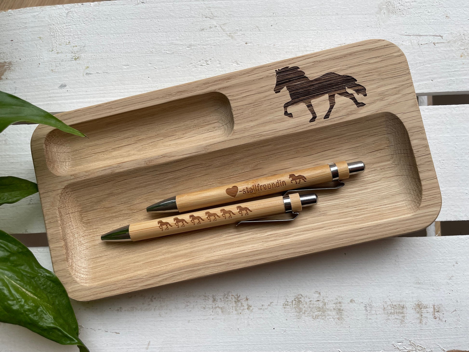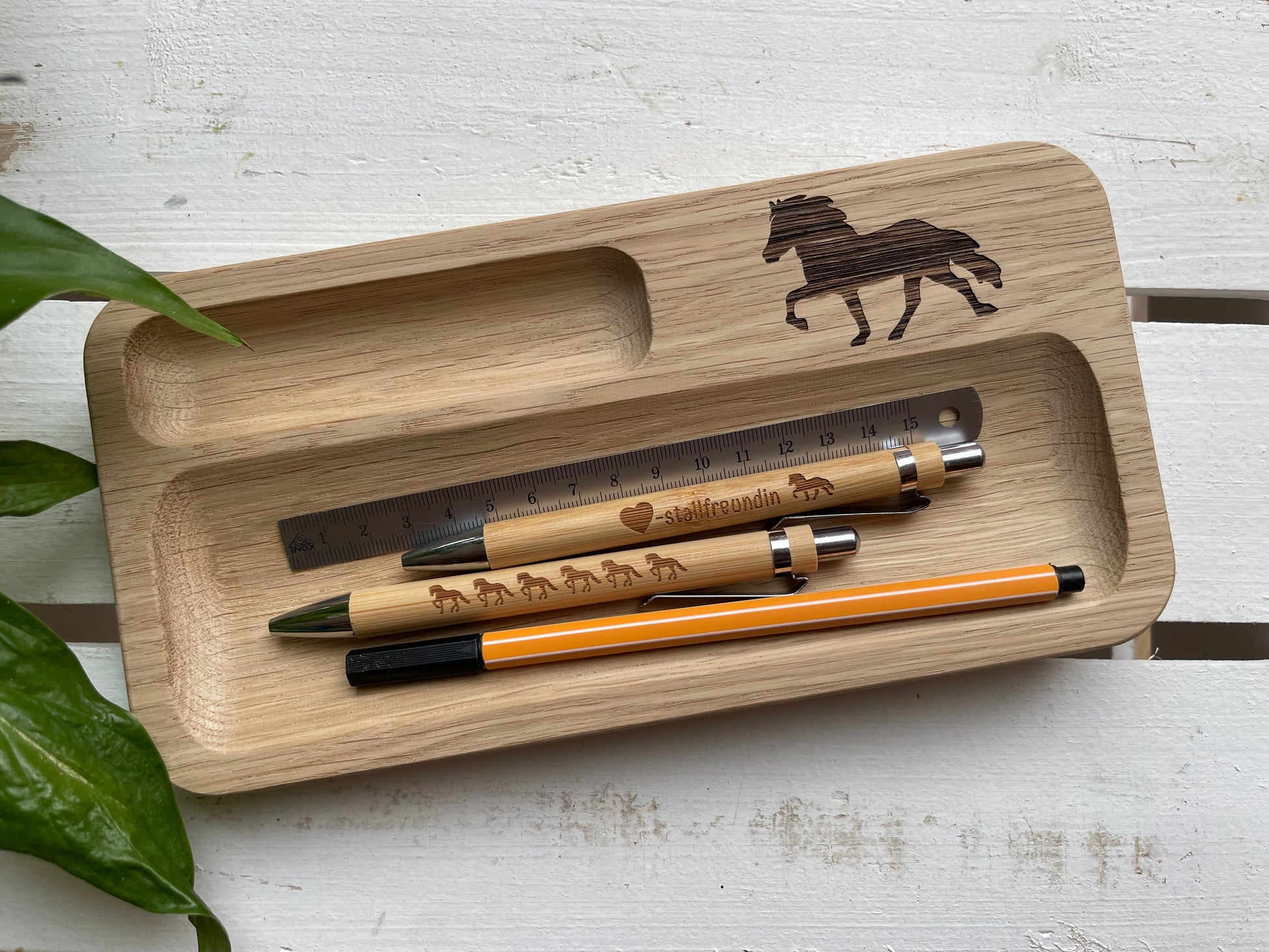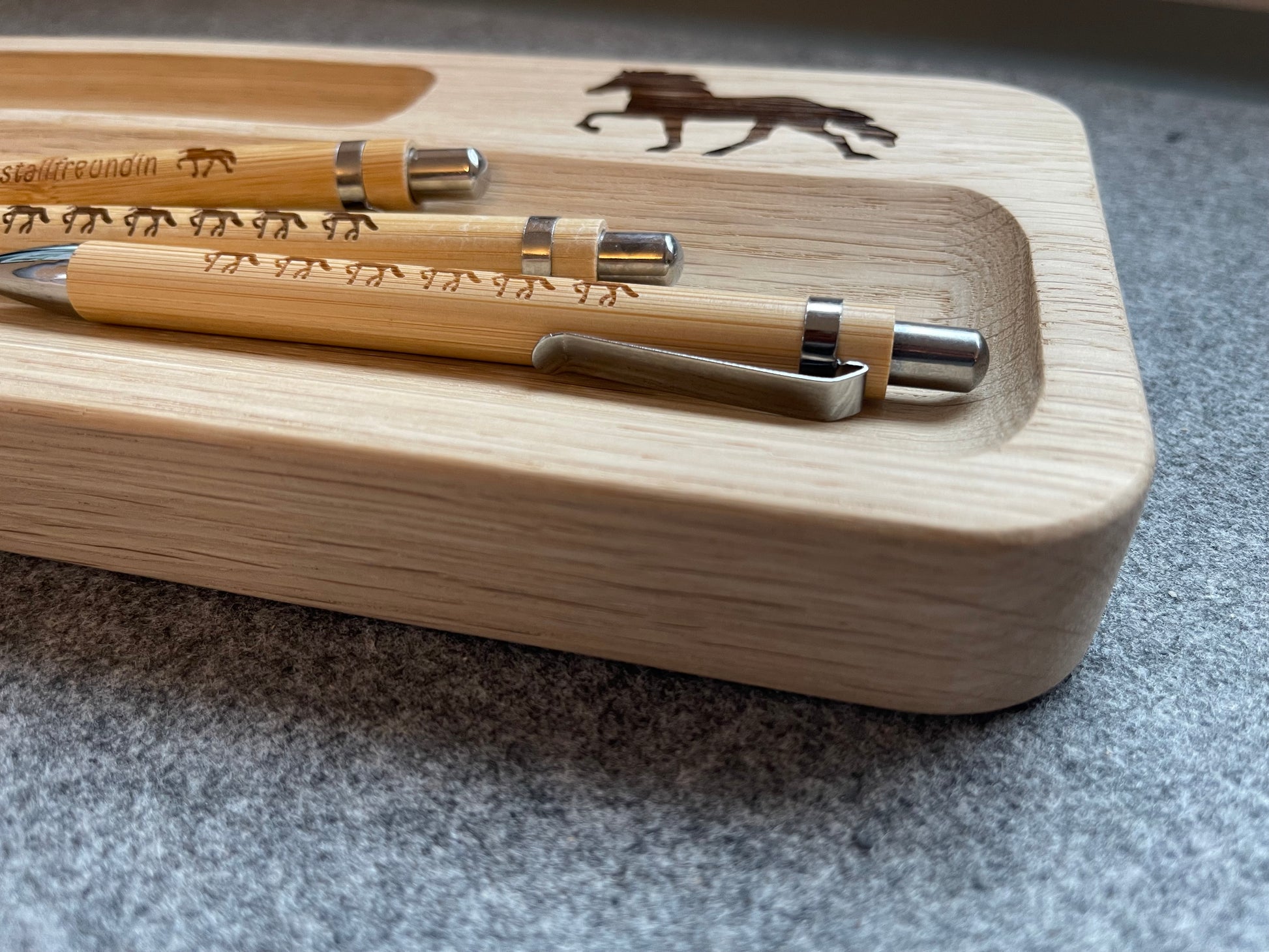 Diese edle Stifteschale vereint funktionales Design mit handwerklicher Präzision. Gefertigt aus einem Stück massiven Eiche, überzeugt sie durch ihre natürliche Maserung, hohe Stabilität und eine besonders wertige Haptik. Das Töltermotiv verleiht der Schale eine besondere Ausstrahlung und macht sie zu einem Blickfang auf jedem Schreibtisch.